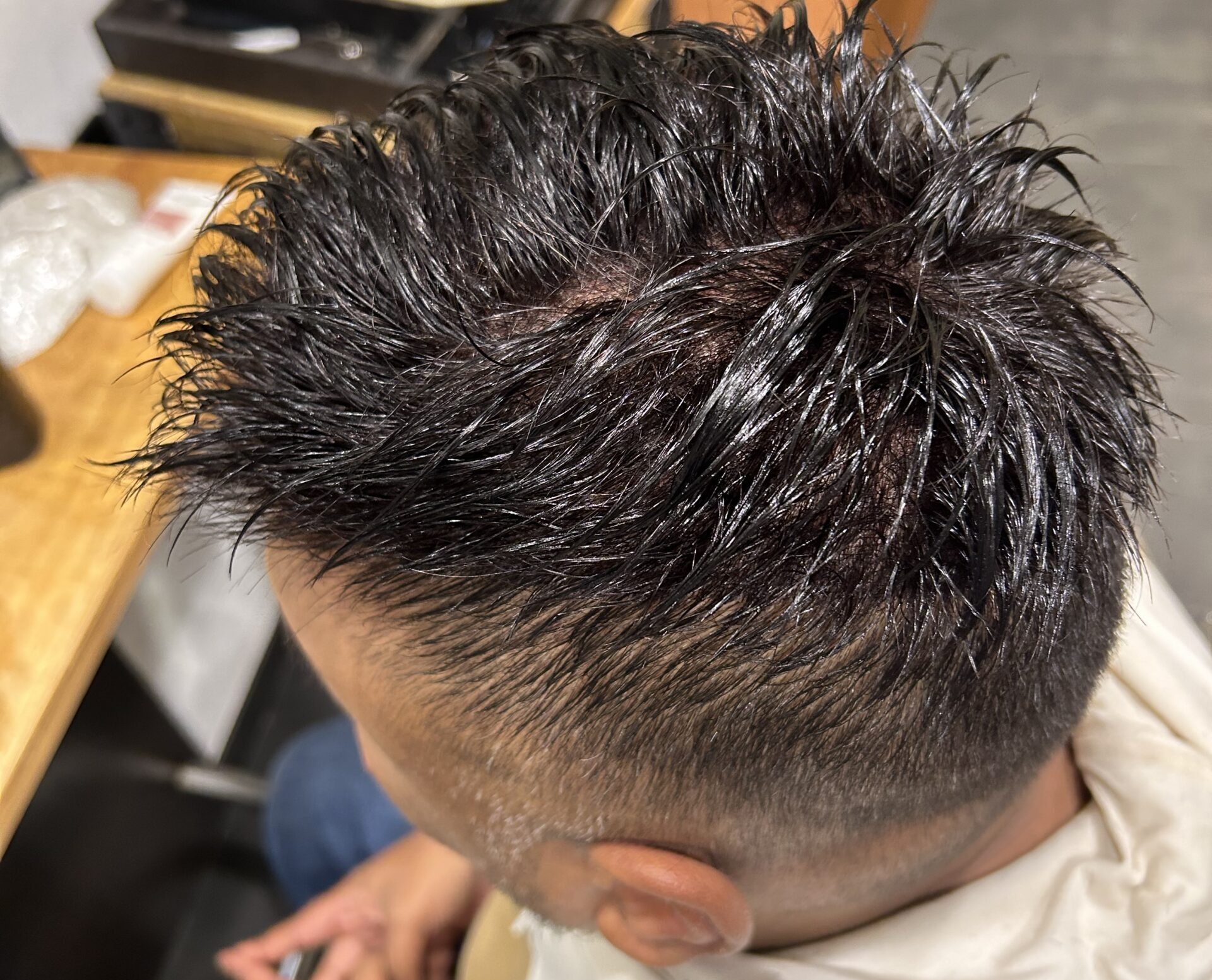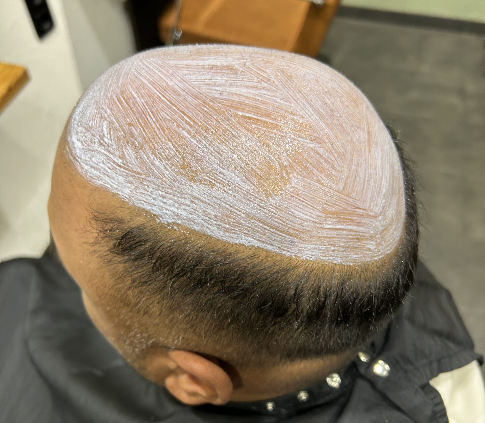 Haardeel word met medicinale lijm op de gladde hoofdhuid vastgelijmd.