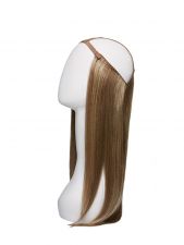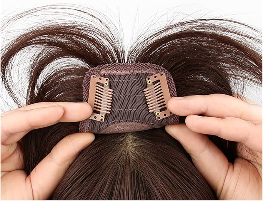 Haarband met clips en een doorzichtig (onzichtbaar) draadje in uw eigen haar bevestigd.